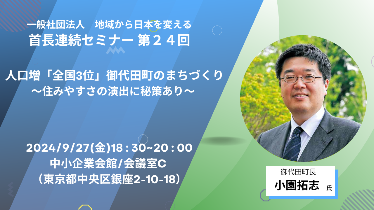第24回 長野県 御代田町 小園 拓志町長 2024 9/13 首長連続セミナー 2024年9月13日 目次開催概要 日 時:2024年9月27日(金)18:30~20:00 場 所:中小企業会館/会議室C 講 師:小園 拓志 御代田町長 テーマ:人口増「全国3位」御代田町のまちづくり ~住みやすさの演出に秘策あり~ 首長連続セミナー 2024年 よかったらシェアしてね! URLをコピーしました! URLをコピーしました!