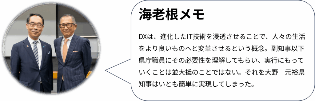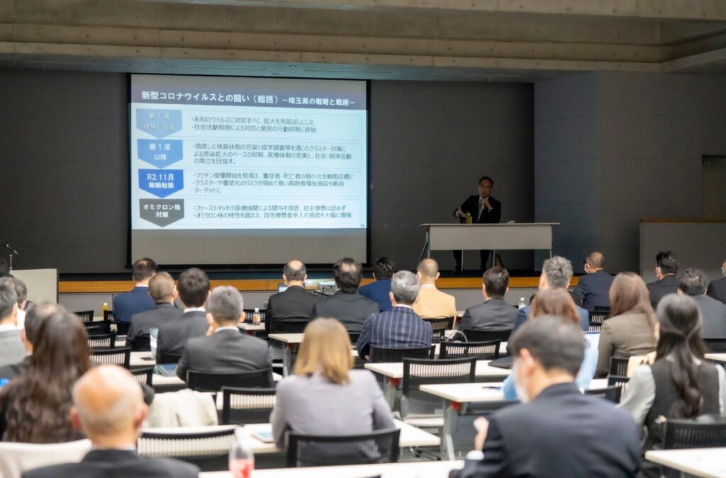 大野知事は、新型コロナへの対応で体制構築やクラスター抑制に尽力し、現場で得た知見から高齢者施設への重点対策やワクチン接種徹底を進めたと述べました。また、産官学金労が連携する経済戦略会議を設置し、感染対策と経済活動の両立を図ったことを紹介。さらに「日本一暮らしやすい埼玉」を掲げ、DXを段階的に推進し、ペーパーレス化や業務効率化を実現。抵抗勢力も巻き込み、時代の変化に応じた改革を進める姿勢を語られました。