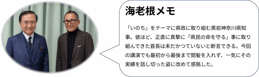 黒岩知事は、自身の救急医療報道の経験を原点に、医療制度の改革と「未病を治す」取組を紹介しました。病気になる前の段階で健康を維持する未病の概念を広め、食事・運動・社会参加を通じて高齢化に対応する重要性を強調。神奈川県は超高齢社会の最前線として、世界に向け「いのち輝く社会(Vibrant “Inochi”)」を発信し、日本モデルを国際社会へ示すチャンスであると語られました。