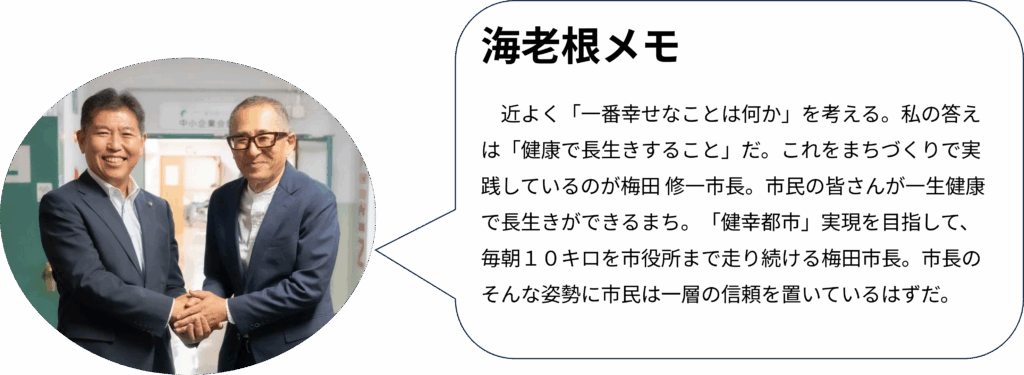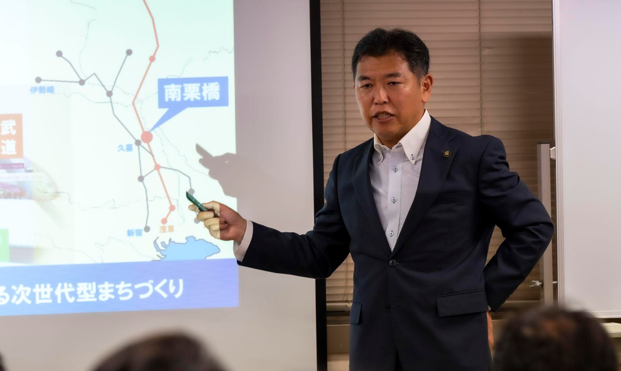 梅田市長は、久喜市のまちづくりの柱として「スーパーシティ構想」と「スポーツ・健康都市戦略」を紹介しました。南栗橋駅周辺で大規模開発を進める一方、地形を活かしたマラソンを軸にしたスポーツ振興を推進。農地活用や都市農業にも力を入れています。さらに、子育て支援として医療費無償化や現金給付を実施し、若い世代が希望を持って住み続けられる街づくりを目指す姿勢を示しました。