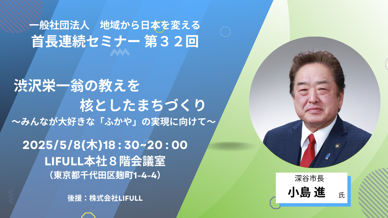 第32回 埼玉県 深谷市 小島 進市長 2025 5/13 首長連続セミナー 2025年5月13日 目次開催概要 日 時:2025年5月8日(木)18:30~20:00 場 所:LIFULL本社8階 講 師:小島 進 深谷市長 テーマ:渋沢栄一翁の教えを核としたまちづくり ~みんなが大好きな「ふかや」の実現に向けて~ 首長連続セミナー 2025年 よかったらシェアしてね! URLをコピーしました! URLをコピーしました!